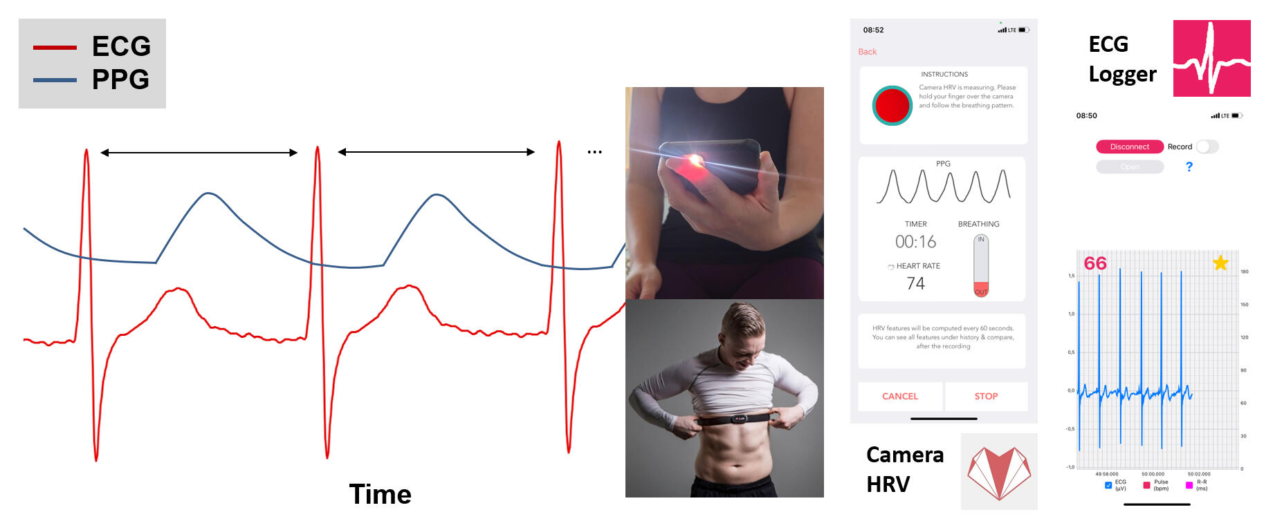 For valid HRV acquisition through electrophysiological measurements, a sampling rate of at least 250 Hz is recommended to accurately detect the R-peak. Specific analyses show robust results even at lower sampling rate depending on the selected HRV analysis parameters and principle of measurement. In order to increase usability and user compliance in field applications, new measurement principles based on PPG are now being used also for HRV assessment during resting conditions. PPG is a simple non-invasive optical technique in which the skin is illuminated by an LED (for example, the flash of a phone) and the reflected amount of light is detected by a photodetector or camera near the light source. The amount of reflected light depends on the volume in the vascular system. After systole the blood volume increases, decreasing the received light intensity, and during diastole the blood volume decreases, increasing the light reflection - therefore, the volume changes can be used to detect the pulse wave. The PPG signal can be used to detect HR and HRV - but more specifically, the signal provides pulse rate (PR) and pulse rate variability (PRV).Below you can see one schematic example of a single lead ECG tracing and the pulse wave from PPG technology as well as two smartphone applications to collect the PPG signal via the phone camera and ECG signal with a chest strap device.