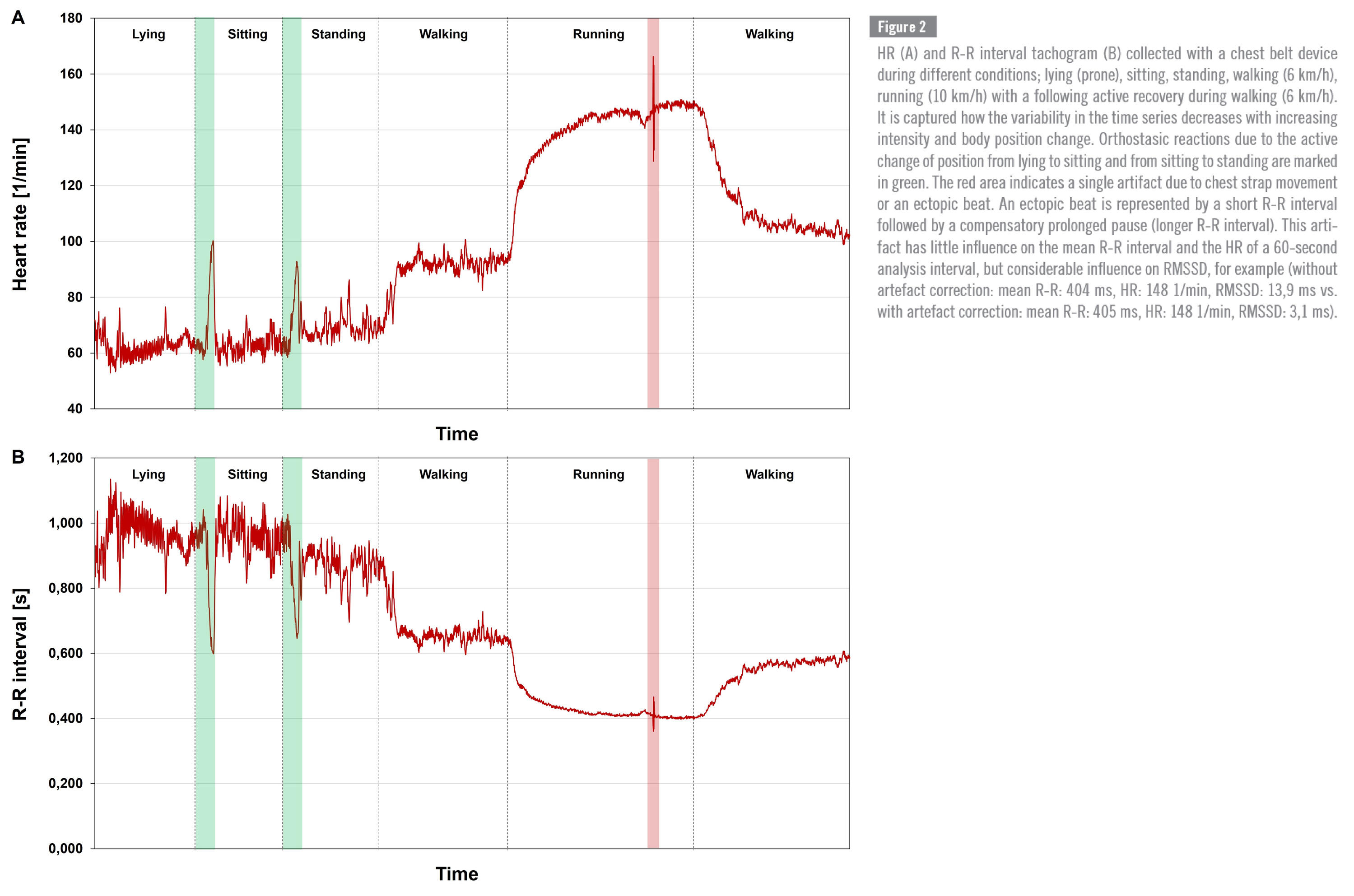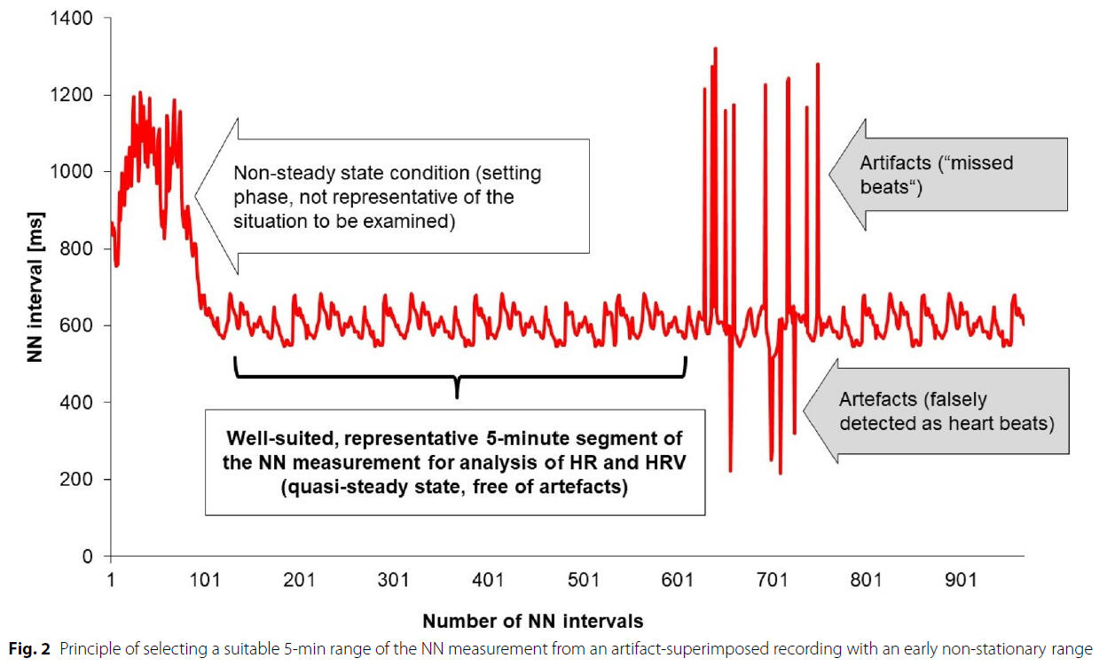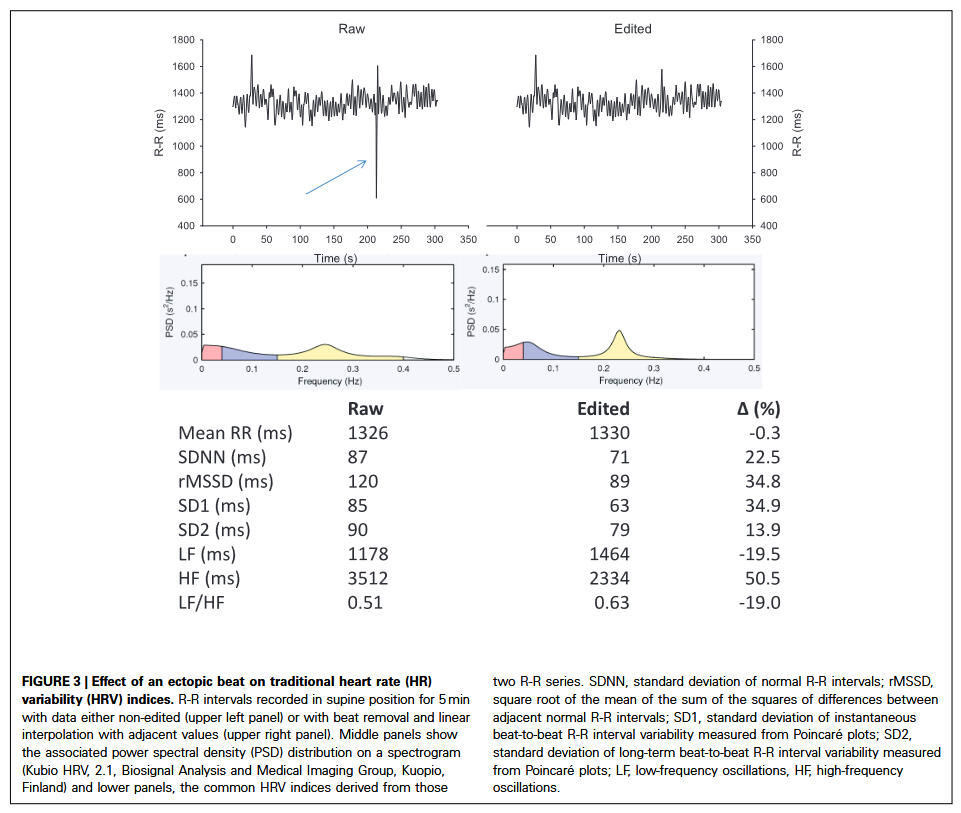 All HRV assessment technologies are affected by artifacts and/or noise, therefore disclosure of artifact detection/correction methods as well artifact rates (mostly below 5-10%) is mandatory. This is especially true for applied settings that involve different body positions, body movements and physiological strain. Besides the context-sensitive choice of measurement duration, as well as the detection and removal of artifacts (e.g., extra beats, noise, missing beats), HRV analysis software applications should include detrending and interpolation options for R-R time series using transparent algorithms to ensure sufficient data quality and to fulfill signal requirements for further calculation of specific metrics of the time-, frequency-, and non-linear domains (see table below). The following figure and caption shows the influence of one single ectopic beat artefact on the visual signal and HRV metrics.