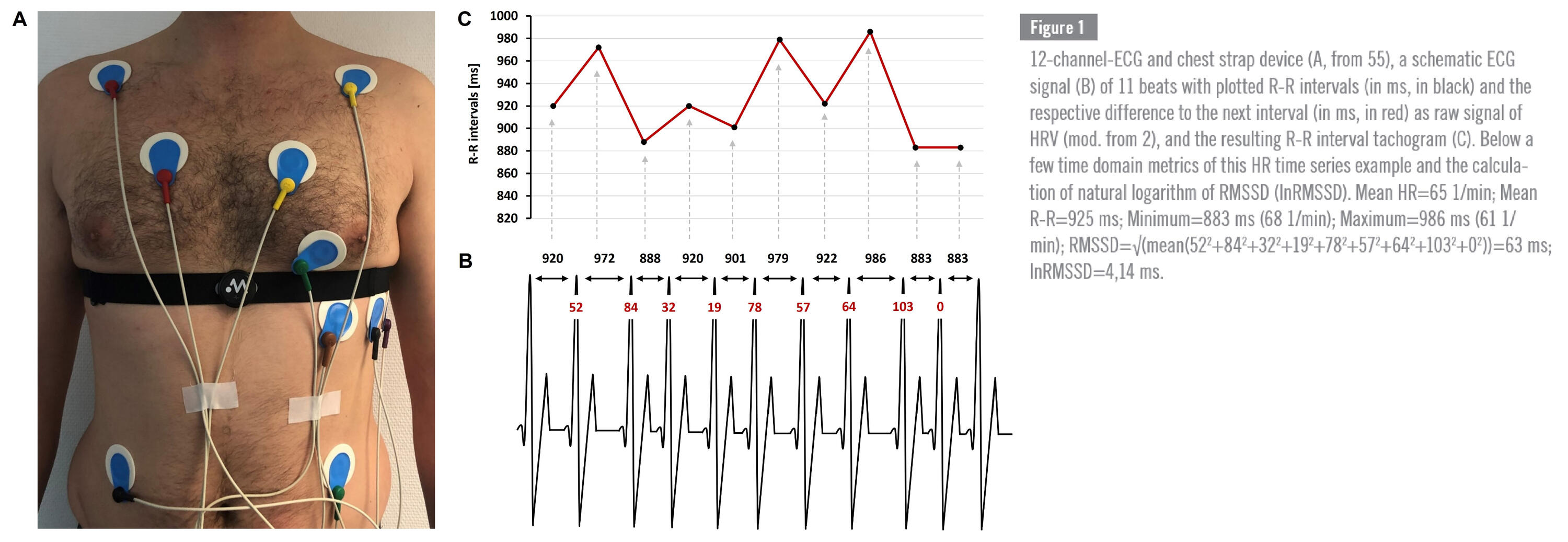 A valid and reliable assessment of the time between two successive heartbeats, referred to as the R-R interval in milliseconds, is most crucial for a scientific and practical use of HRV as the R-R interval (based on the detection of the R-wave in the PQRST complex of an electrocardiogram, ECG) time series serves as the base for any HRV metric.