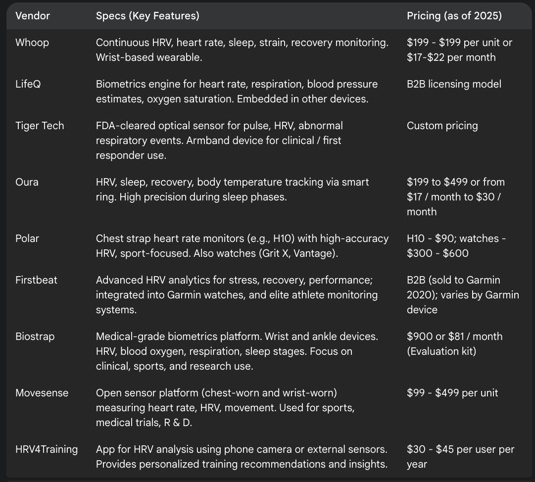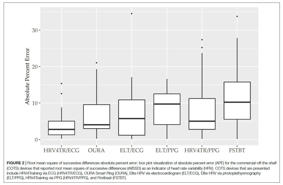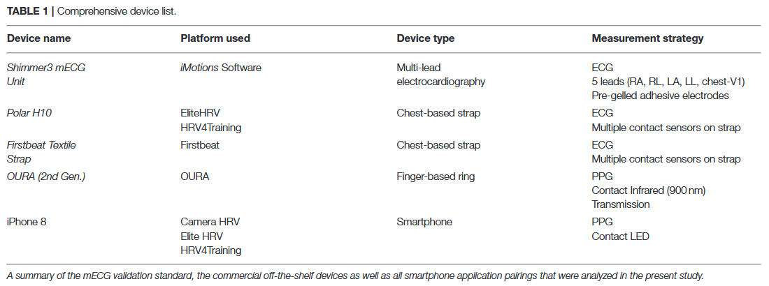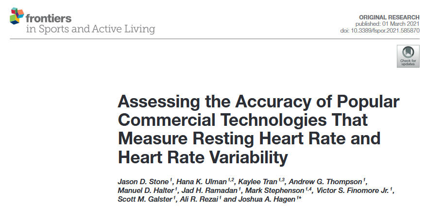 • Stone, J. D., Ulman, H. K., Tran, K., Thompson, A. G., Halter, M. D., Ramadan, J. H., Stephenson, M., Finomore, V. S., Jr, Galster, S. M., Rezai, A. R., & Hagen, J. A. (2021). Assessing the Accuracy of Popular Commercial Technologies That Measure Resting Heart Rate and Heart Rate Variability. Frontiers in Sports and Active Living, 3, 585870. https://doi.org/10.3389/fspor.2021.585870