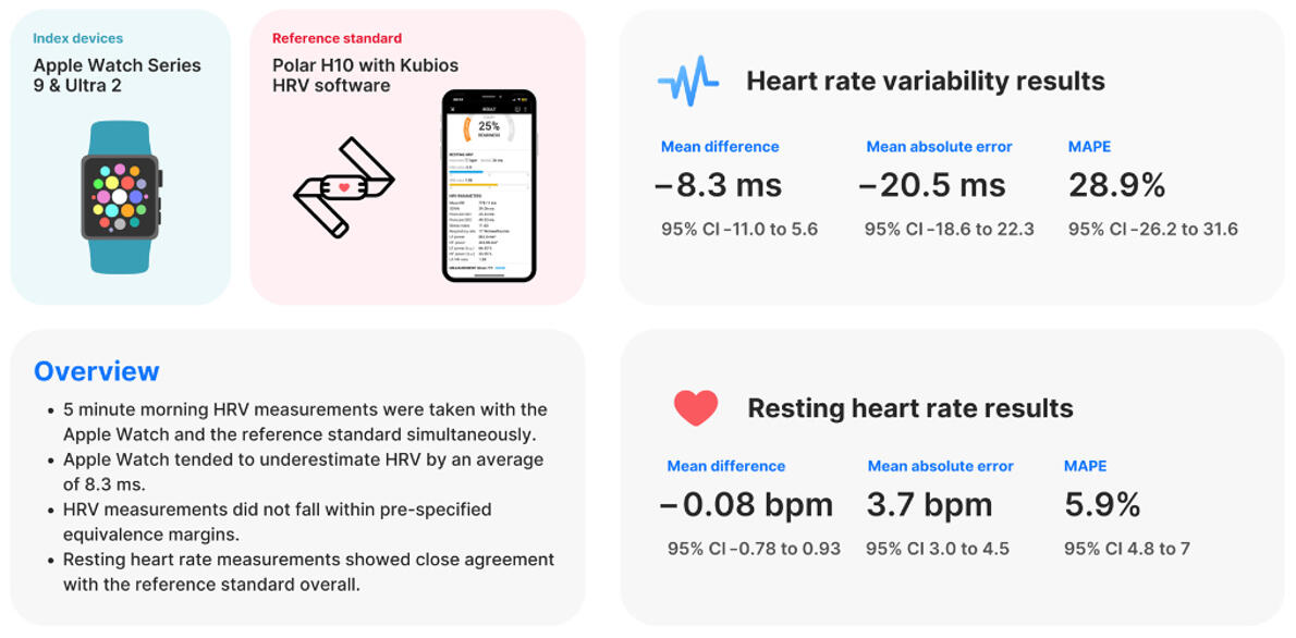 The results suggest that HRV measurements acquired using portable devices demonstrate a small amount of absolute error when compared to ECG. However, this small error is acceptable when considering the improved practicality and compliance of HRV measurements acquired through portable devices in the field setting. Practitioners and researchers should consider the cost-benefit along with the simplicity of the measurement when attempting to increase compliance in acquiring HRV measurements.However, these rather general statements do not exempt the specific evaluation of a new measuring device. You can find one example for the Apple Watch Series 9 with the considerable width of possible measurement errors to be taken into account for HRV measurements. However, it is difficult to keep up with the rapid pace of technological development in order to provide constantly updated validations for different application scenarios and populations.