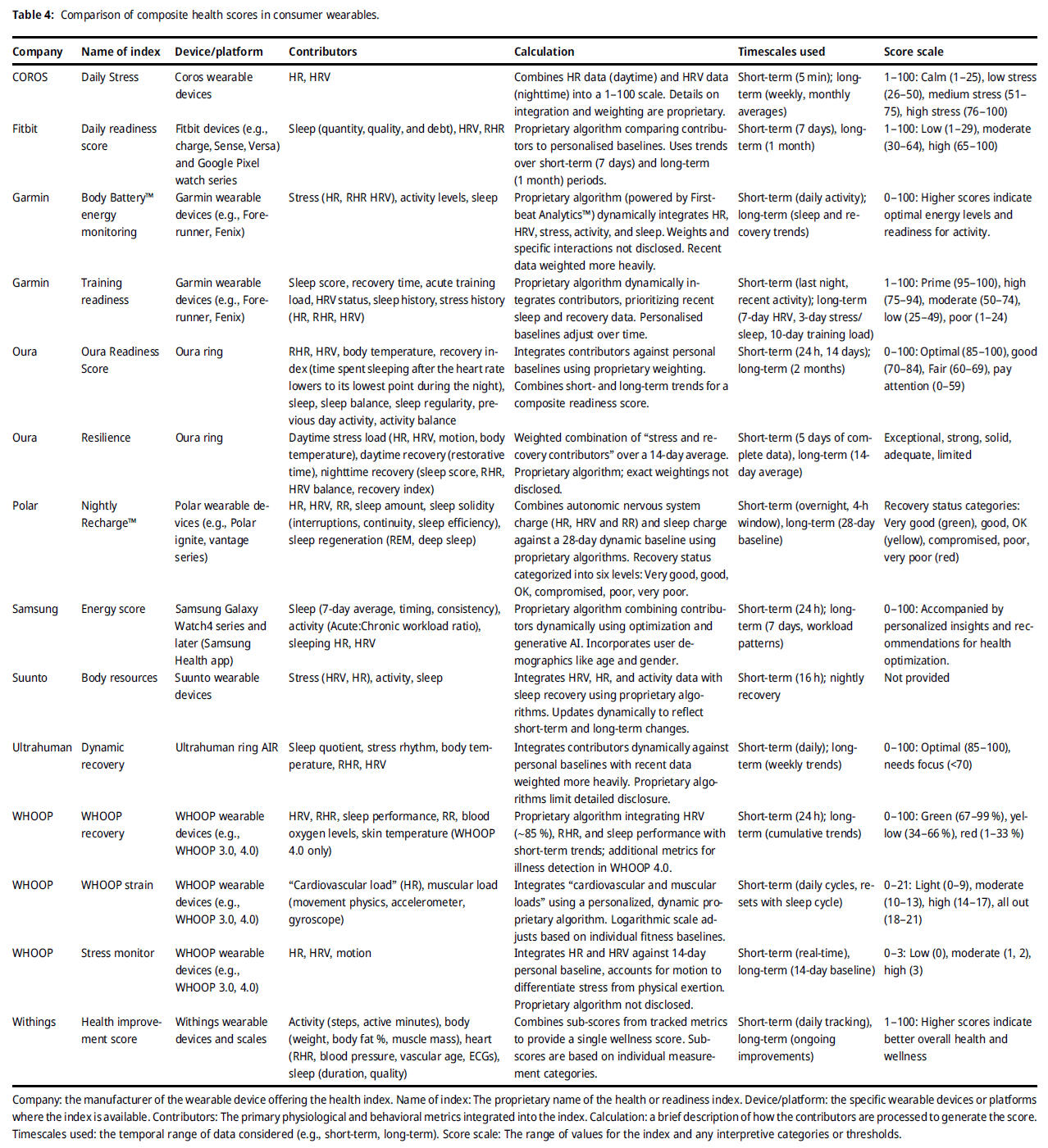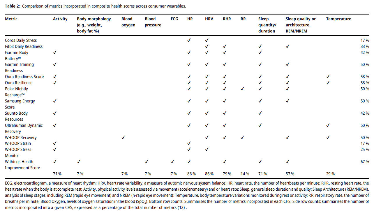 For the scientific use of automatically calculated HRV metrics in commercially available systems and applications at least raw data access and sufficient information on the above-mentioned preprocessing features as well as the calculated metrics itself should be provided. Composite scores (see below for an overview) of different HRV metrics and other included data sources or estimated features without further information should be treated with caution. As mentioned above when analyzing HRV, reference should always be made to specific HRV metrics of the time-, frequency-, and/or non-linear domains, as these metrics may capture quite different HRV components, and their interpretation is always context-sensitive and depends on the setting.Overview of composite scores related to HR and HRV measurements: