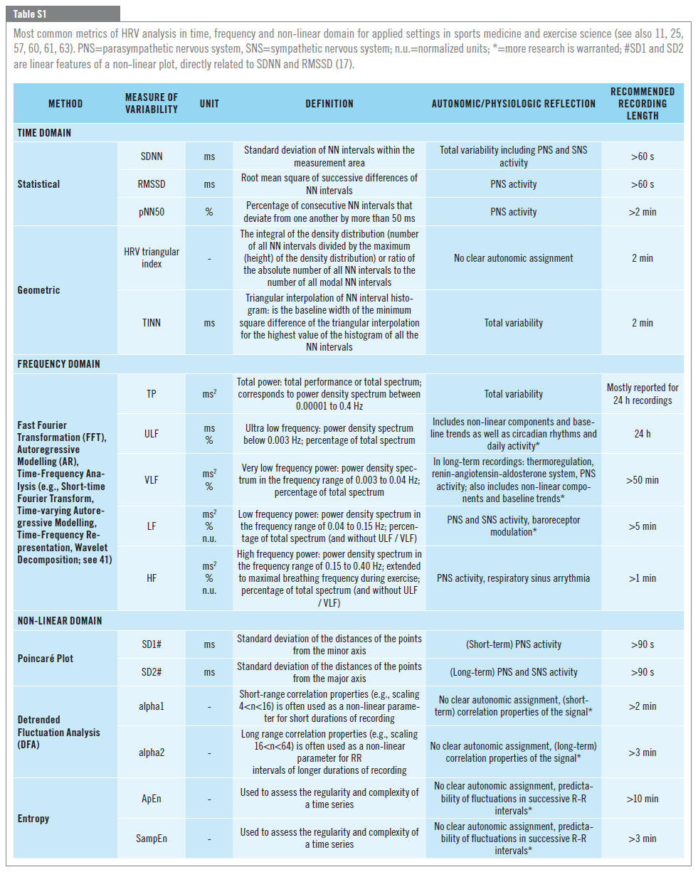 Although 24h HRV-recordings used to represent the “gold standard” for clinical HRV assessment, short-term and ultra-short-term measurements are increasingly used and validated for specific applied settings. Further, it should be noted that for several HRV metrics there is still an ongoing debate about their practical relevance and optimal recording lengths as these strongly depend on the algorithm and the setting. E.g., for stable frequency domain metrics, a recording length of two to ten times the wavelength of the lowest relevant frequency component is recommended, while this might be partly overcome by more sophisticated time-frequency analysis. In addition, several other HRV metrics from e.g., the geometric domain (e.g., HRV triangular index, TINN) were introduced for specific settings, but are not frequently used in sports medicine and exercise science. Therefore, the information from the table above should only be seen as a guideline for a large variety of applications in the field of sports medicine and exercise science.In addition, R-R ¬fluctuations from short term recordings like RMSSD may show a skewed distribution and very high intra- and inter-individual variation between 10-300 ms. Therefore, a logarithmic representation (e.g., lnRMSSD) may help to increase reproducibility, as well as robustness to artifacts and changes in respiratory patterns. Further, HRV metrics of the frequency domain such as HF or LF may require additional considerations regarding the calculation method (nonparametric vs. parametric, standard spectral analysis or time-frequency analysis), the calculation (absolute or normalized values with or without consideration of very low frequency, VLF), and the duration of measurement. Inconsistent results are often generated using simple ratios, which is therefore discouraged (e.g., the LF / HF ratio may not reliably assess the cardiac sympatho-vagal balance). Insights from non-linear HRV analysis are promising in several clinical and applied settings related to sports medicine and exercise science. As non-linear metrics complement linear HRV and rather focus on (fractal) dynamics and complexity of the time series they might expand our knowledge concerning the behaviour of cardiovascular oscillations in normal healthy conditions as well as in disease states in both resting and exercising conditions. However, these measures still need to be further elucidated for a general practical use.