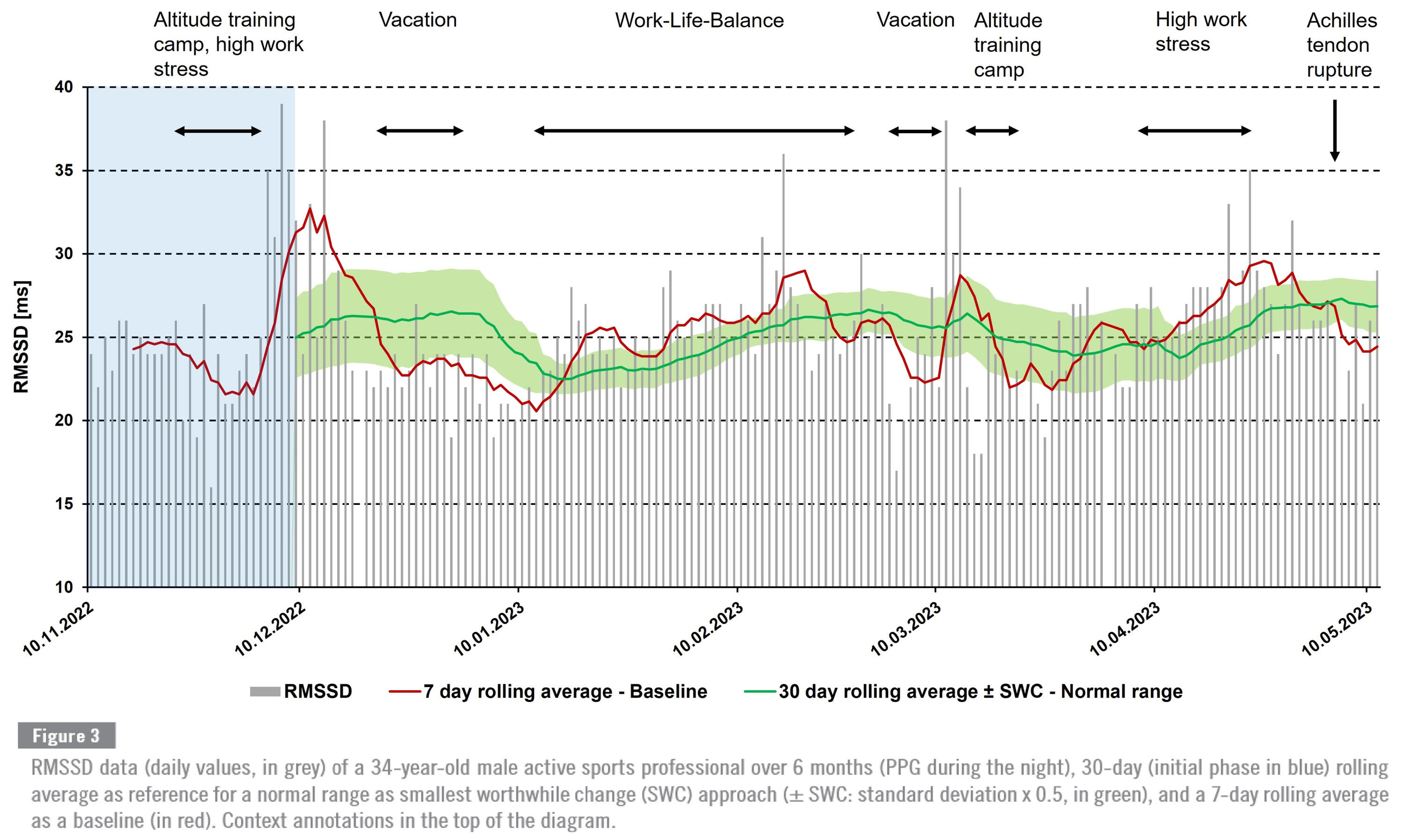 Singular, absolute values of HRV (e.g., for RMSSD) provide only limited information; this also applies to the comparison with reference values, which is primarily recommended for specific and homogeneous populations (e.g., diseases, age groups). Comparing a regular intra-individual baseline may help to interpret daily variations in HRV and a rolling average of mean values is favourable for monitoring processes (e.g., 7-day moving average of at least 3 to 5 measurements a week), also in relation to a normal range reference (like the smallest worthwhile change, SWC) for trend analysis of HRV variations. In addition, it may be useful to calculate the coefficient of variation (CV) as a standardized measure of dispersion, calculated by dividing the standard deviation by the mean, in order to gain an impression of the variations; stable regulation can indicate good adaptation to the stress situation (training, everyday life, etc.). You can find two examples below: