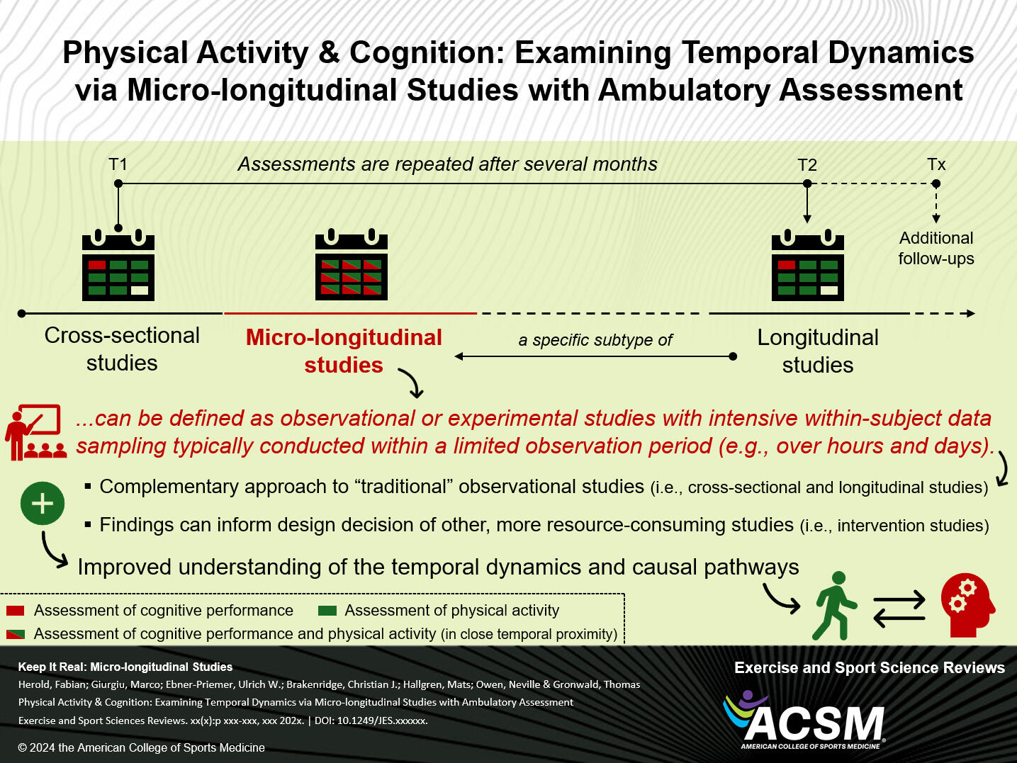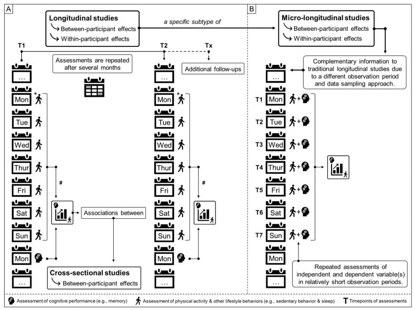 Considering the mentioned context-sensitive requirements, HRV analysis allows for longitudinal trend analysis of patients (including the potential as a remote digital biomarker) and healthy individuals including athletic and non-athletic populations in various clinical and performance-related settings. This includes the application of HRV monitoring for resting conditions, during and/or after biofeedback and training interventions (e.g., breathing interventions, physiological state analysis, intensity domain delineation), as well as general relationships between recovery status, previous exercise conditions, and symptoms of overreaching and overtraining.In regards of longitudinal data analysis, we highlight the advantages of examining temporal dynamics with ambulatory data assessments (e.g., wearables) via micro-longitudinal studies in our new „Perspectives for Progress“ article in „Exercise & Sports Science Reviews“ - using the example of the emerging field of physical activity and cognition. This study approach characterizes frequent within-subject real-life-embedded assessment methods of exposure(s) and outcome(s) in relatively short periods. In addition to the utility to address outstanding research questions, micro-longitudinal studies with ambulatory assessments are also well-situated to complement the evidence obtained from traditional study approaches by strengthening the capacity for causal inferences via a methodological and/or data triangulation, and better informing more resource-intensive, causality-confirming study approaches.In our specific research, we are particularly interested in contextual information necessary to interpret, e.g., psycho-physiological wearable monitoring data (with potential large day-to-day variation and multiple confounding factors such as HRV data), which can be implemented very well within this methodological study approach. Compared to highly controlled intervention studies (e.g., randomized controlled trials), observational studies (e.g., longitudinal studies) provide the key advantages that they are typically (1) less resource-consuming and expensive, (2) have less restrictive exclusion criteria, which strengthens the representability and generalizability with high ecological validity, and (3) less prone to expectancy bias as no intervention is offered.