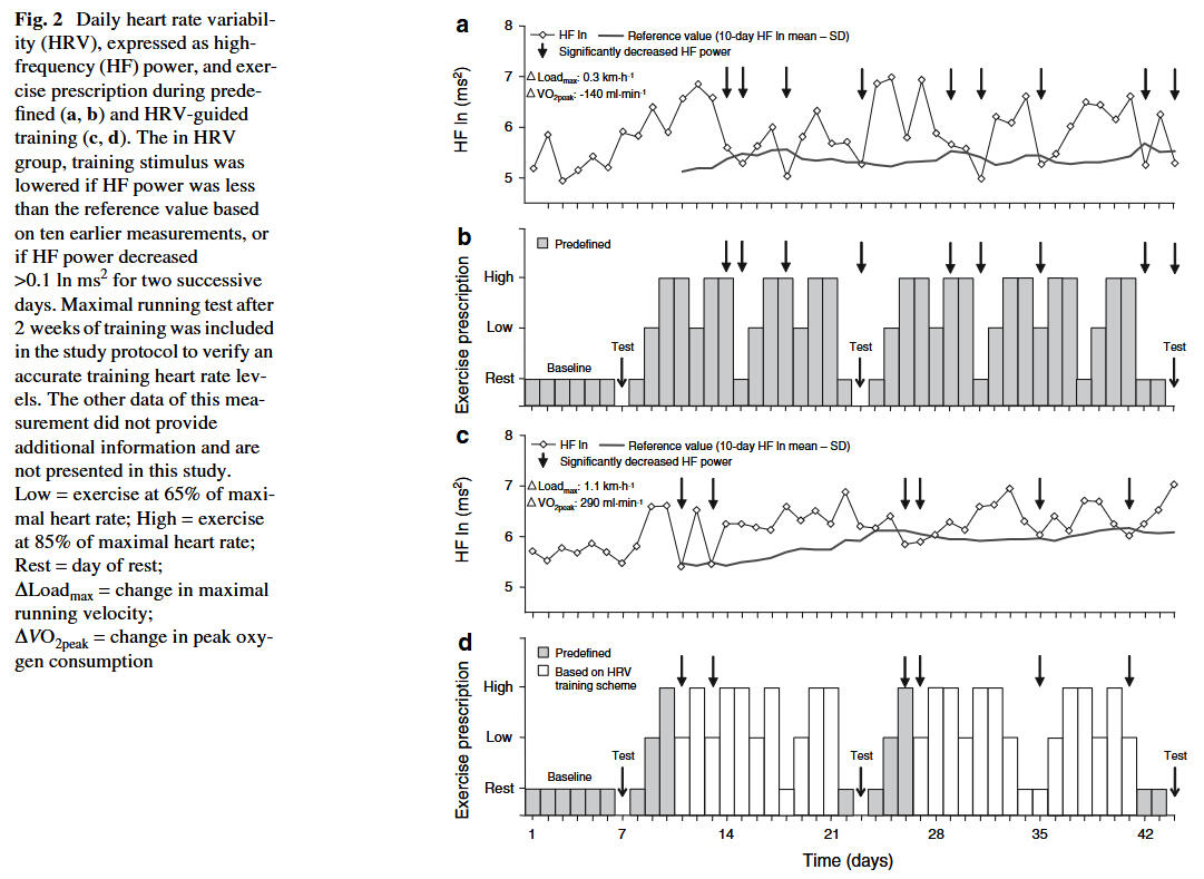 In first studies by Kiviniemi and colleagues it could be shown that cardiorespiratory fitness can be effectively improved during endurance training by using daily HRV (from HF domain) for exercise prescription. A lower-intensity training stimulus, whenever attenuated vagally mediated HRV occurs, might be beneficial to gain favorable response in endurance training.