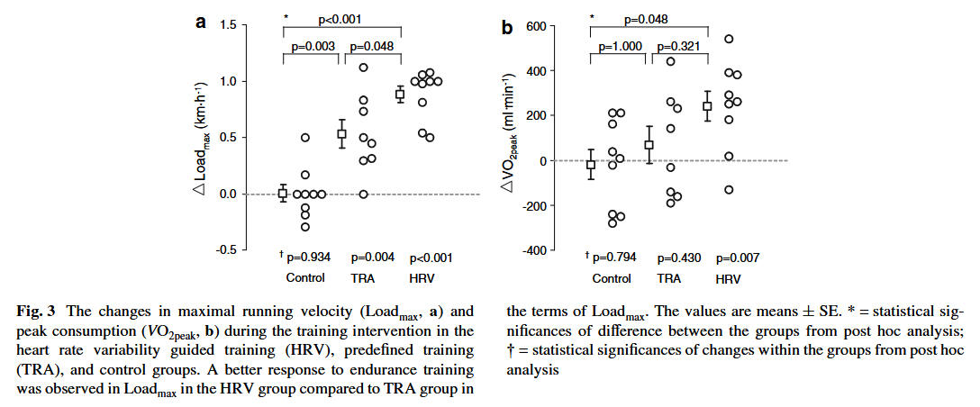In recent systematic reviews with meta-analysis Düking and colleagues concluded that 4-8 weeks of either HRV-based training or predefined training improves running performance and certain related physiological parameters like submaximal and maximal oxygen consumption. Enhancement of performance and submaximal physiological adaptations appear to be more pronounced with HRV-based training which involves fewer sessions of moderate and/or intense training. In addition, they found that there were fewer non-responders regarding performance with HRV-based training. These conclusions should be considered to be somewhat preliminary, since the available research in this area is both limited and inconsistent.