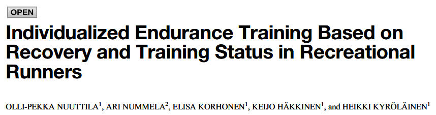 • Nuuttila, O.-P., Nummela, A., Korhonen, E., Häkkinen, K., & Kyröläinen, H. (2022). Individualized Endurance Training Based on Recovery and Training Status in Recreational Runners. Medicine & Science in Sports & Exercise, 54(10), 1690–1701. https://doi.org/10.1249/mss.0000000000002968