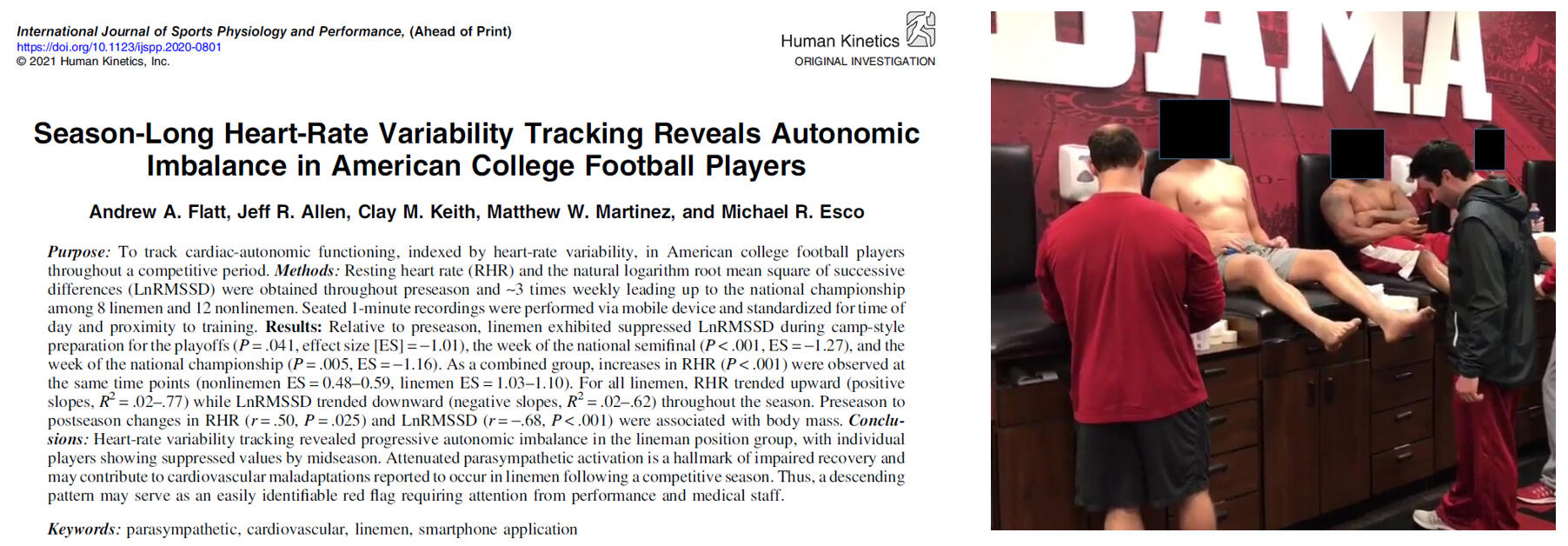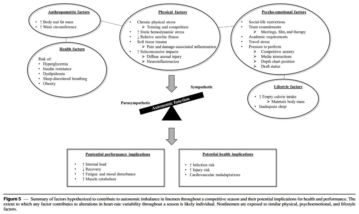 Serial tracking of ultrashort-term HRV with mobile devices at the training facility enabled timely detection of cardiac-parasympathetic suppression among individual players. Factors hypothesized to contribute to autonomic imbalance in linemen and their potential implications for health and performance are summarized in the figure below. Implementation of recovery modalities and lifestyle practices that aim to maintain parasympathetic activation in linemen may limit sustained decrements throughout the season. Due to differences in health conditions, body mass, physical demands, and aerobic fitness among position groups, periodic modification of training frequency or intensity may be required to manage the season-long impact of football participation on autonomic functioning in linemen. Elevations in resting HR conceivably predispose players to concomitant elevations in exercising HR. Thus, such players may experience increased physiological strain (ie, greater internal load) during a typical training session throughout the mid-to-late competitive period.In addition to being a hallmark of impaired recovery, parasympathetic hypoactivity may contribute to cardiovascular maladaptations reported to occur in linemen following a competitive season. Though a better understanding of the health and performance ramifications of suppressed HRV in linemen is needed, a descending pattern in daily values may serve as an easily identifiable red flag requiring attention from performance and medical staff.