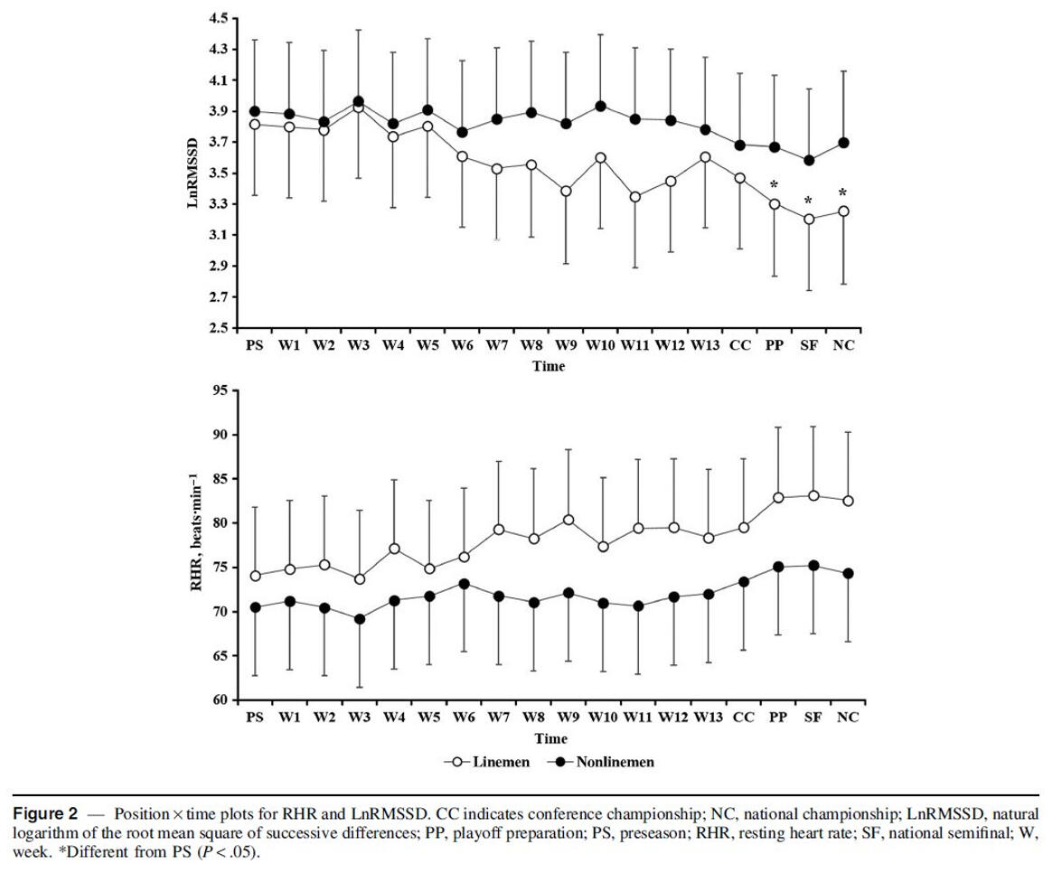 Tracking HRV in college football players throughout a competitive season revealed progressive autonomic imbalance among the linemen position group. Although significant reductions in LnRMSSD were not observed until the postseason, individual players experienced sustained decrements at earlier time points and in the absence of intensified training. These findings highlight potential deficiencies in or greater taxation to the coping capacity of linemen during the competitive phase. Serial HRV tracking facilitated timely detection of suppressed values, indicating a potential role formobile devices in guiding and monitoring interventions relevant to players’ health and performance.
