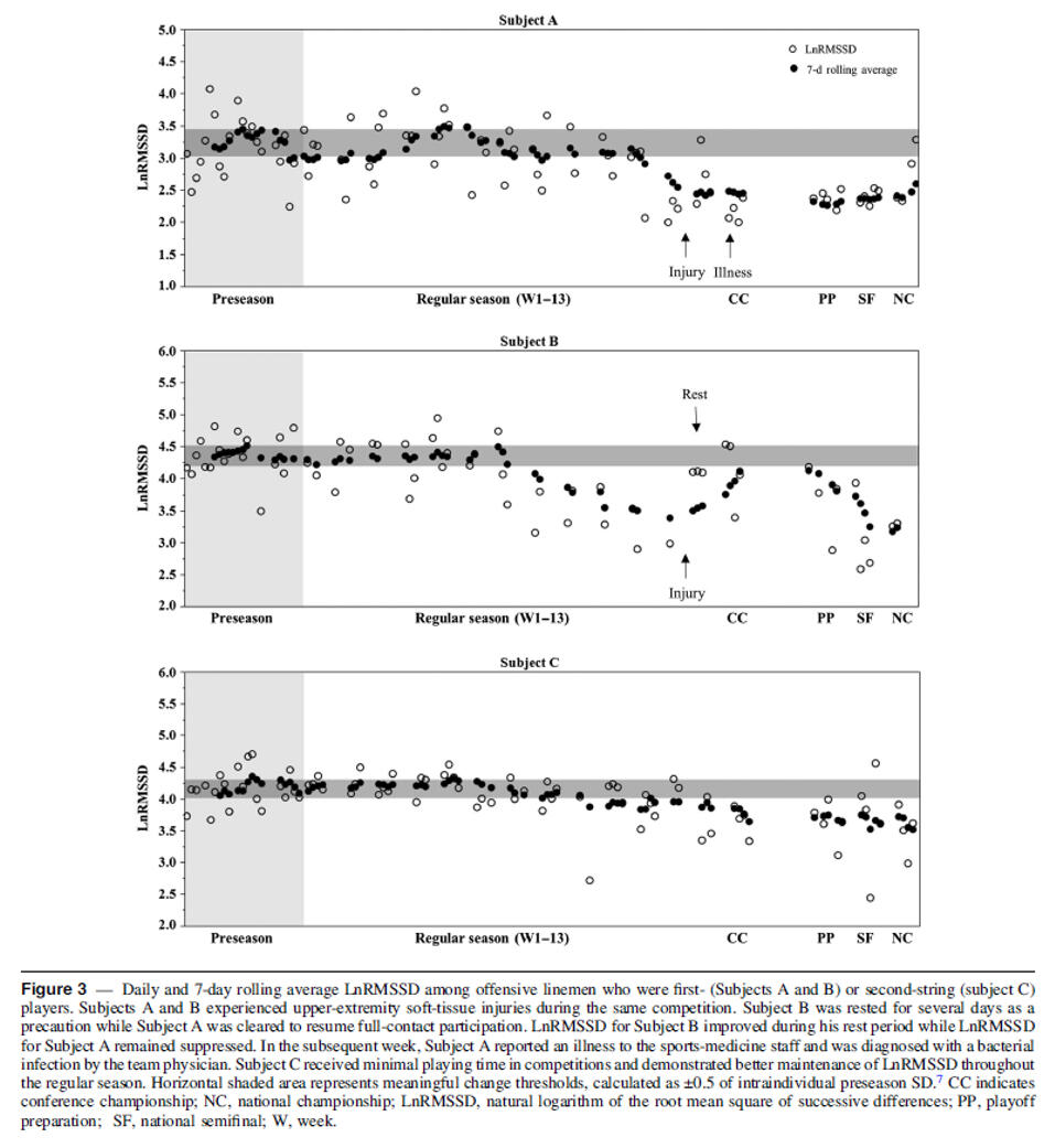 In conclusion, the current study provided evidence that, although predefined training improves endurance performance, individualized endurance training may induce greater improvements in running performance and increase the probability of high response while decreasing the occurrence of low or negative responses to endurance training. In the future, the most suitable markers to be used in monitoring as well as the exact method of how training load could be manipulated during different types of periods should be examined in more detail.Further, in an interesting study from Flatt and colleagues the purpose was to prospectively monitor HRV in college football players throughout an entire competitive season. HRV (RMSSD) was approximated via PPG technology, enabled by an optical pulse-wave finger-sensor and a mobile application from „ithlete“. Time-demand from players was ~3 min/week while waiting to get taped. Though sub-optimal relative to post-waking measures, this approach enabled timely detection of descending patterns, which may be useful for guiding interventions relevant to player health and wellbeing. The authors hypothesized that linemen (predominantly larger players) would experience greater decrements in HRV than nonlinemen.