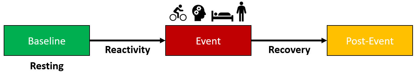 Laborde et al. (2017) suggest the experimental or practical structure of the three „Rs“ as „Resting“ (baseline), „Reactivity“ (event; stress, physical exercise, change in body position), and „Recovery“ (post-event) measurements. Using this structure allows for the evaluation of tonic HRV for each of this measurement time points and also for the analysis of phasic HRV changes (baseline vs. event like a task, demand: e.g., physical exercise, event vs. post-event, baseline vs. post-event).