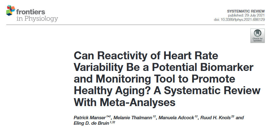 • Manser, P., Thalmann, M., Adcock, M., Knols, R. H., & de Bruin, E. D. (2021). Can Reactivity of Heart Rate Variability Be a Potential Biomarker and Monitoring Tool to Promote Healthy Aging? A Systematic Review With Meta-Analyses. Frontiers in Physiology, 12, 686129. https://doi.org/10.3389/fphys.2021.686129