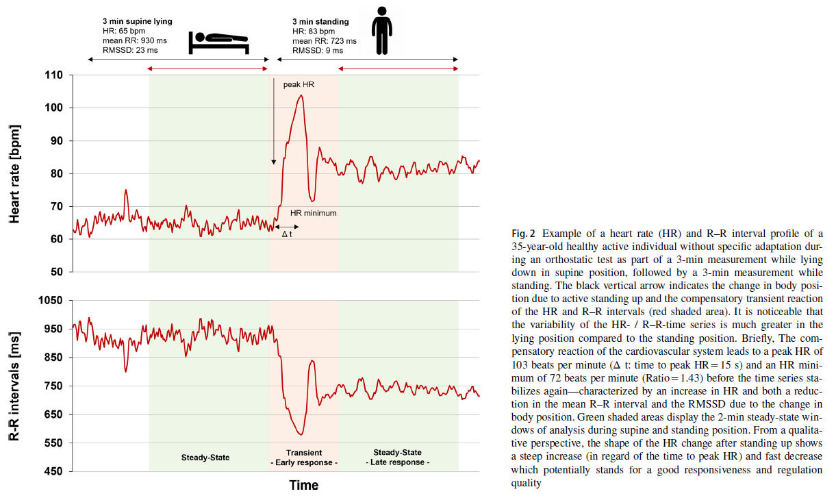 Further information like resting HR, psychometrical scales and other contextual information may overcome the lack of specificity in the interpretation of HRV values. Application of existing standards is mandatory to derive appropriate interpretations. However, higher values (trends) of vagally driven time- and frequency-domain metrics under resting conditions are generally associated with more functionally efficient cardiac autonomic control, whereas HRV declines and becomes more regular with age or disease, revealing a loss of variability and complexity. Lifestyle factors (e.g., physical activity, smoking behavior, alcohol consumption, body composition) are associated with adaptations of cardiac vagal function in this context, so a healthy lifestyle can be considered preventive for reducing age-related decline of positive autonomic regulatory dynamics. The usefulness of HRV as an indicator of physiological and pathological conditions, for risk stratification, and as a marker of autonomic adaptive and regulatory capacity is evident. However, longitudinal data recordings are recommended when trend analysis with contextual data is intended. In addition, the reference setting of resting conditions in supine position can be complemented by active orthostatic tests (supine vs. standing, see below for further information and recommendations), other stress-related conditions like physical exercise, and recovery measurements as these provide additional information on ANS regulation dynamics. However, special care must be taken with both HRV assessment and analysis during stress/exercise and recovery as increased non-stationarity, degraded signal-to-noise ratio and additional physiological phenomena (e.g., cardio-respiratory-locomotor-coupling) may complicate its straightforward use and interpretation.The following study is recommended for the interpretation and context of HRV measurements and the authors conclude:„A camera-based, smartphone app could be used to collect longitudinal data in free-living in a large sample of individuals. Using a simple, one minute measurement upon waking, we could confirm the results of previously published studies as well as provide additional insights on the relationship between resting HR, HRV, population-level characteristics, and acute stressors. There are important implications to these findings. HRV is currently used in sports settings as well as for health and fitness tracking in the general population. However, targeting improvements in HRV as intervention goals might not be realistic, given the strong heritability coupled with age and low explained variance associated with lifestyle factors such as physical activity levels. On the other hand, HRV is able to capture day-to-day stressors within individuals with high sensitivity and might therefore be better suited for such day-to-day stress assessment and management. HRV might be used to infer changes in, e.g., training, while resting HR might be better suited for observing changes in larger stressors, such as sickness. We conclude that resting HR and HRV can effectively be used to quantify individual stress responses across a large range of individual characteristics and stressors. Individual awareness of stress responses might facilitate training guidance, behavioral change, and just-in-time interventions in the future.“