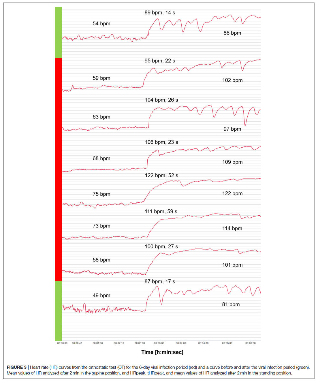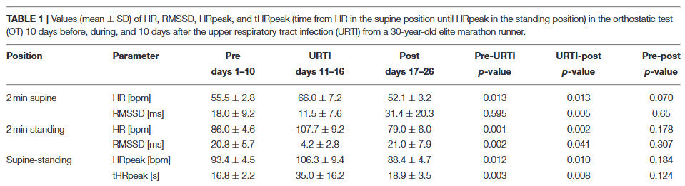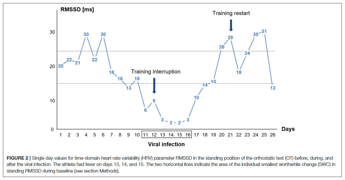 The findings of this case report have some implications for sports practitioners and coaches looking to both ensure the health of their athletes, and for using HRV as a tool to monitor training process and the return to sport after a viral infection. For endurance athletes, a control by means of resting HR in one body position does not seem to be sufficient. Accordingly, the data have provided supportive rationale as to why the orthostatic test with a change from supine to standing body position and the detection of different indicators based on HR and a vagal driven time-domain HRV parameter (RMSSD) is likely to be useful to detect viral diseases early on when implemented in a daily routine. Given the case study nature of the findings, future research has to be conducted to investigate whether the use of the orthostatic test might be able to offer an innovative, non-invasive, and time-efficient possibility to detect and evaluate the health status of (elite endurance) athletes.