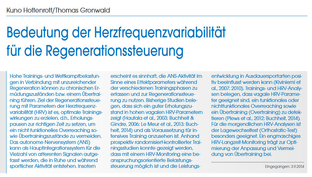 • Schneider, C., Wiewelhove, T., Raeder, C., Flatt, A. A., Hoos, O., Hottenrott, L., Schumbera, O., Kellmann, M., Meyer, T., Pfeiffer, M., & Ferrauti, A. (2019). Heart Rate Variability Monitoring During Strength and High-Intensity Interval Training Overload Microcycles. Frontiers in Physiology, 10, 582. https://doi.org/10.3389/fphys.2019.00582