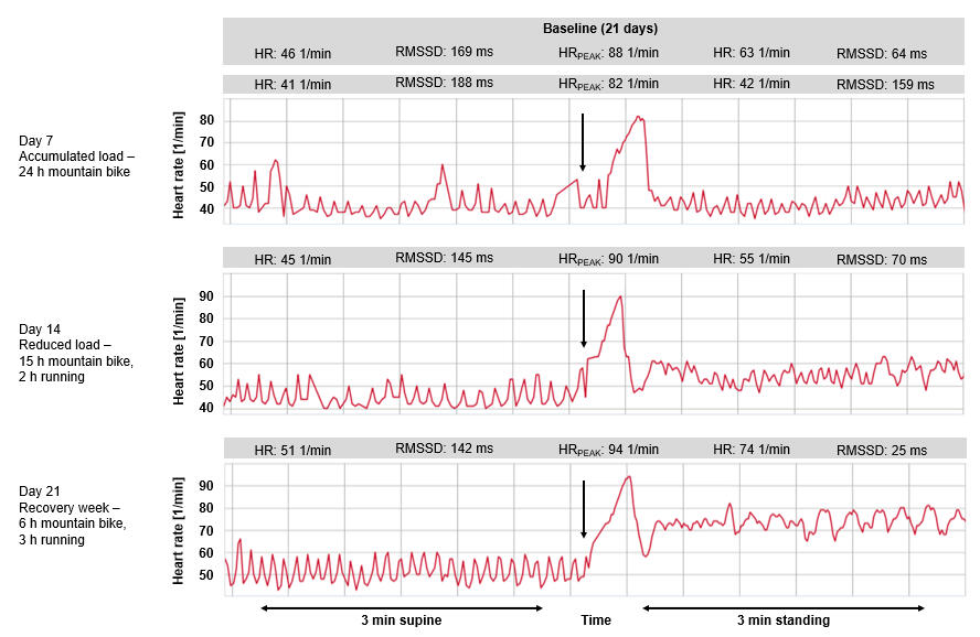 Here, a model is used to illustrate how changes in HR and vagal activity (RMSSD) can be recorded, and then evaluated (the measurement was taken with the Polar V800 and a chest strap with H7 sensor daily for three weeks in the morning after waking up). The values shown are from day 7 after extensive mountain bike (MTB) training (24 hours per week) in the French Alps, from day 14 after 15 hours of MTB and 2 hours of running training with a reduced total volume, and from day 21 after a recovery week with 6 hours of MTB and 3 hours of running training, as well as the average values of the measurements from a baseline over 21 days.The black vertical arrow marks the change in position and the compensatory response of the HR. The autonomic nervous system responds to regular endurance training with pronounced bradycardia as a result of increased vagal tone (HR when lying down or standing of 41 or 42 beats per minute, RMSSD when lying down or standing of 188 or 159 ms). The athlete is not in a state of overtraining, but rather in a functional accumulated load (overreaching) situation, because with a reduction in volume training, vagal tone decreases and the values approach the average values. In order to gain more certainty in the interpretation of the values from the orthostatic tests, additional contextual information such as sleep time, sleep behavior, stress and fatigue level, as well as everyday activities should be analyzed in addition to training.