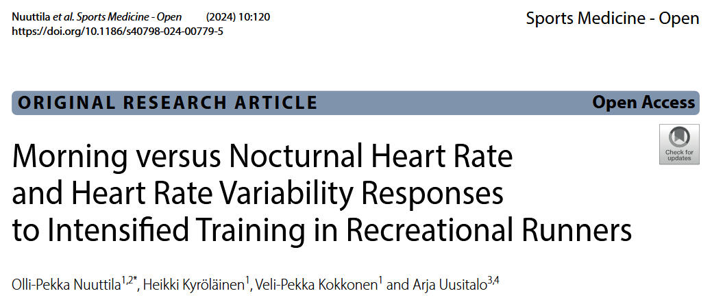 • Nuuttila, O.-P., Kyröläinen, H., Kokkonen, V.-P., & Uusitalo, A. (2024). Morning versus Nocturnal Heart Rate and Heart Rate Variability Responses to Intensified Training in Recreational Runners. Sports Medicine - Open, 10(1), 120. https://doi.org/10.1186/s40798-02